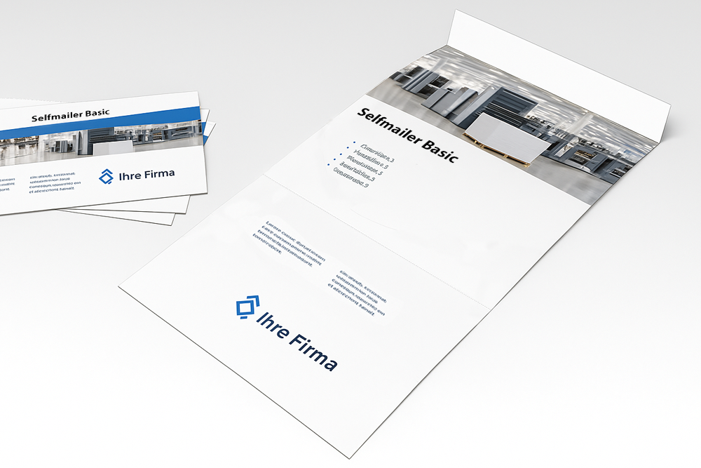Der Mailer ohne Umschlag. Mit einem optimierten Format und maximaler Gestaltungsfläche spart Ihnen der Selfmailer Basic eine Menge Portokosten – portooptimiert und werbewirksam.❦