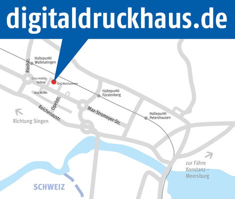 Sie kommen von der B 33 in Richtung Konstanz-Industriegebiet / Schweiz. Vorbei am Flugplatz biegen Sie nach dem Ortseingang gleich links in die Riedstraße. Im folgenden Kreisverkehr fahren Sie bitte die erste rechts ab. Nach ca. 300 m biegen Sie bei ARO Heimtextilien nach links, nach 100 m biegen Sie nach rechts auf den großen Betriebshof. An der Stirnseite befindet sich unsere Druckerei, gekennzeichnete Kundenparkplätze stehen für Sie bereit.